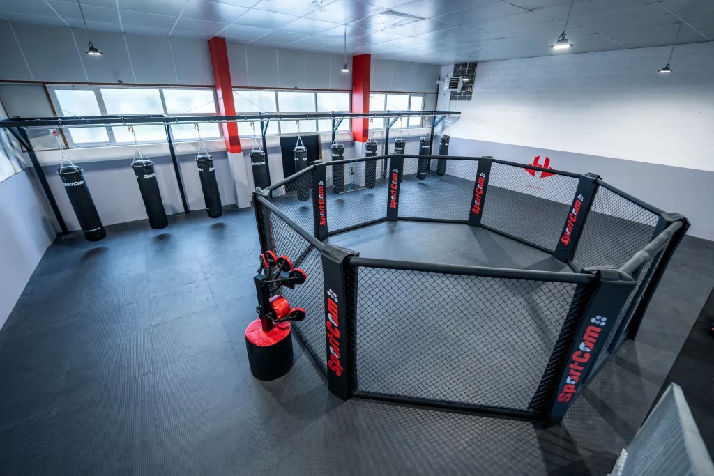 Surface entièrement recouverte de tatami et sacs de frappe professionnels le tout à l’intérieur d’une cage de combat font de cet espace un espace unique.